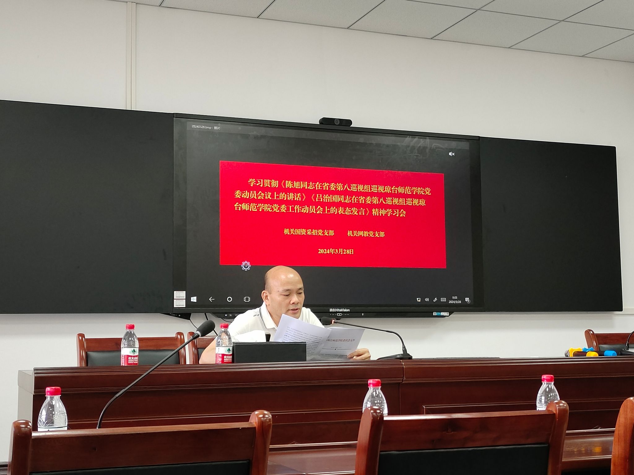 2024年3月28日,机关国资采招党支部联合机关网教党支部在桂林洋校区行政楼四楼会议室召开了学习会,学习贯彻校党委印发的《关于印发〈陈旭同志在省委第八巡视组巡视琼台师范学院党委动员会议上的讲话〉和〈吕治国同志在省委第八巡视组巡视琼台师范学院党委工作动员会上的表态发言〉的通知》琼台党〔2024〕16号文件精神。